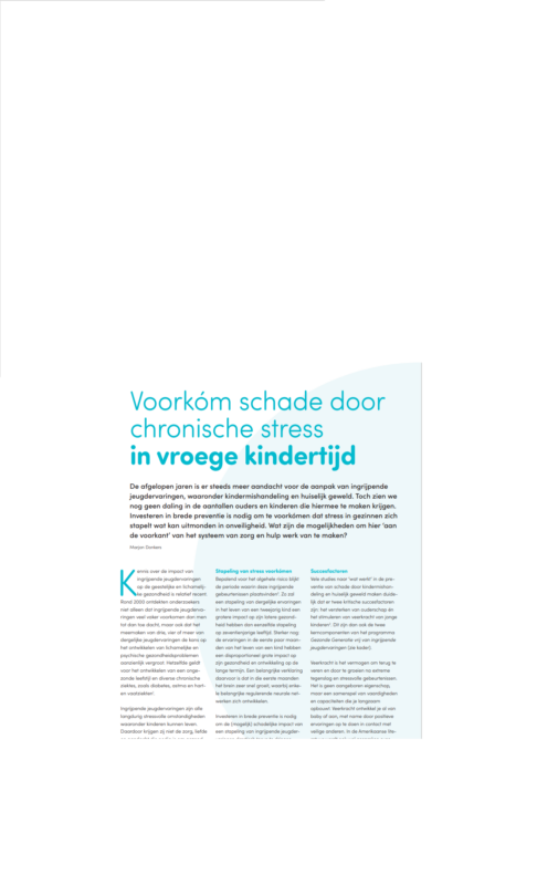 Vakblad Vroeg is er voor professionals die werken in de geboortezorg en met kinderen tot zeven jaar en hun ouders. In het artikel wordt gepleit voor meer aandacht voor het voorkómen van gezondheidsschade door chronische stress en worden het geven van meer waardering, erkenning en ondersteuning van álle ouders genoemd als cruciale zaken om kinderen te helpen gezond en veilig op te laten groeien. Lees hier het volledige artikel.